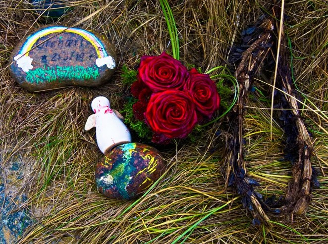 Rørende var det tillige at erfare, at der dér på skråningen var blevet plads til en påmindelse om en, der var engang… jeg er ikke sikker på indskriften, men blev da lidt nysgerrig på, hvem der kunne være så heldig at blive mindet med sten, engel, roser og krans…