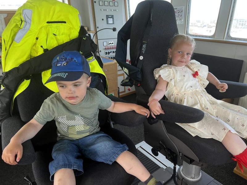 Endelig er der åbent skib på ATHENA. Her fik begge lov til styre skibet i styrehuset. Så gik turen hjemad. Begge børn var trætte efter de mange indtryk og havde også både fået viden og mange ting med hjem.