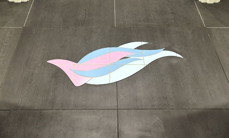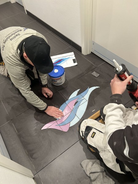 Hvad gør man lige, når man har et flot og flerfarvet logo, som man gerne vil have lagt ned i et flisegulv. Hos ringede man selvfølgelig bare til verdens bedste flisemurer fra Hæstrup Murerforretning ApS.