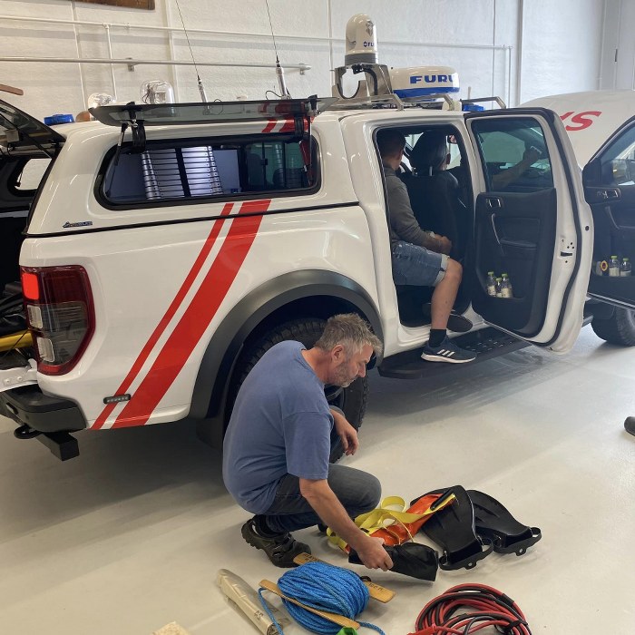 Dens mange funktioner samt bilens redningsudstyr blev gennemgået. Teknisk set er bilen udstyret med både radar, plotter og flir, som er et varmesøgende kamera og selvfølgelig diverse radioer som VHF og SINE. Redderne tog også en grundig gennemgang af den lille FRB 14, som er en forkortelse for Fast Rescue Boat.