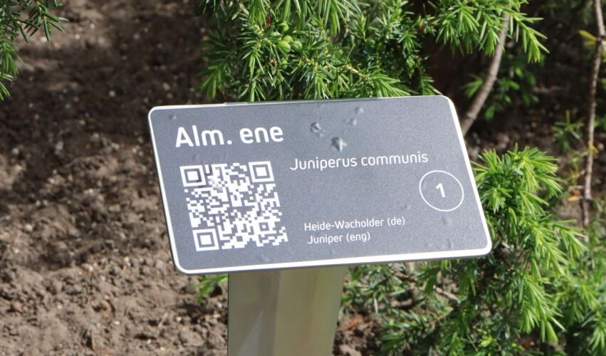 På billedet ses en prototype af de nye skilte. Som noget nyt vil der være en QR kode på hvert skilt, så man kan finde flere informationer om planterne på museets hjemmeside – såmænd bare ved at bruge den telefon, man alligevel går med i lommen.