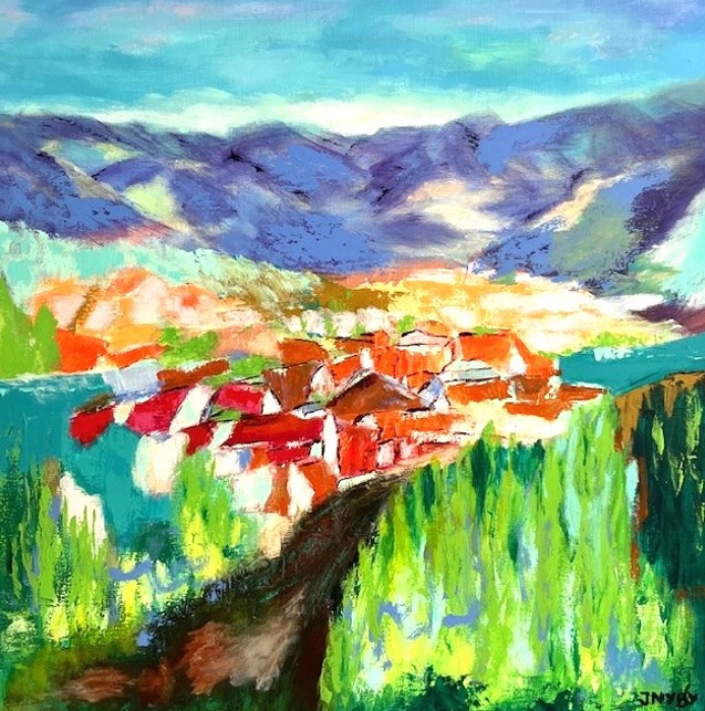 ”I et og samme maleri kan man således se himlen gengivet med fejende vandrette strøg, husene med små præcise rektangulære og trekantede konturlinjer og træerne med bløde runde penselbevægelser. I det konkrete maleri kan man også se en kontrast mellem det stærkt opfyldte midterfelt med de tæt sammenstillede huse og himlen, hvor de store linjer og massive farveflader hersker. Det er disse kompositoriske og koloristiske træk, der karakteriserer Janni Nybys landskabsmalerier. Hun bruger dem som et billedmæssigt udtryksrum, hvorfra hun kan skabe et utal af forskellige varianter med hver deres farvespil, hver deres dynamik og hver deres stemning. Hvert maleri har kort sagt sin egen grundrytme og sin egen farvemusik, og det er en udsøgt fornøjelse at betragte og føle disse billeduniverser.”