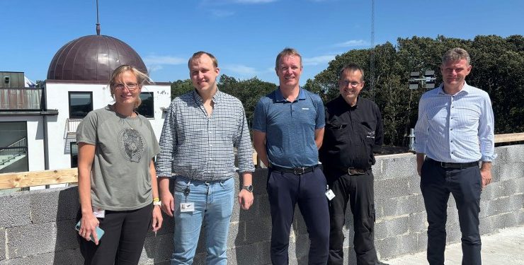 Fra venstre mod højre har ledelse og kolleger budt velkommen til Nadia Krogh Hedegaard, som er ansat som chefkonsulent, Commercial & Partners, Mads Engbo Christiansen, der er ansat som koblingsleder, René Gjerlev Pedersen, der er ansat som netværksarkitekt og specialist samt servicemedarbejderen Morten.