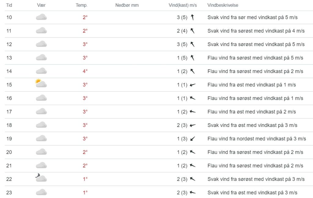 Temperaturer mellem 1 og 4 graders varme og svag til jævn skiftende vind i det nordvestlige Vendsyssel. I aften og i nat fortsat mest skyet med lidt regn, slud eller måske sne, idet der er risiko for stedvis tåge. Temperaturer ned mellem 3 graders frost og 2 graders varme, og svag til jævn skiftende vind. Nedenfor ses vejrets udvikling nytårsdag i Hirtshals.