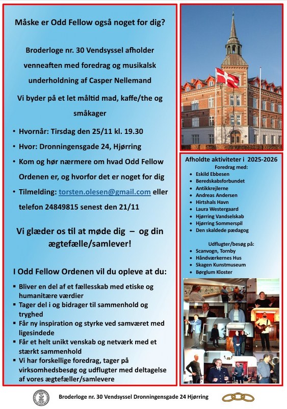 Odd Fellow Loge nr. 30 Vendsyssel i Hjørring åbner dørene for nysgerrige sjæle, når logen inviterer til venneaften den 25. november kl. 19.30.
