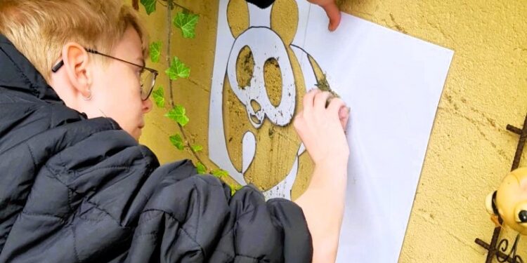 Herefter fik eleverne lov til at afprøve den økologisk graffiti på en af murene i gårdhaven. Da projektet er i samarbejde med WWF – Verdensnaturfonden, blev der selvfølgelig malet en panda.