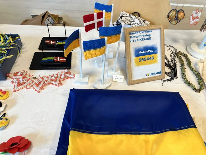 Salg af smukke, håndlavede smykker, tøj, flag med videre, lotteri og andet spændende indbragte penge, der sendes til Ukraine. Vi kan i øvrigt alle stadig støtte det krigsramte folk. Og bede om fred på jord.
