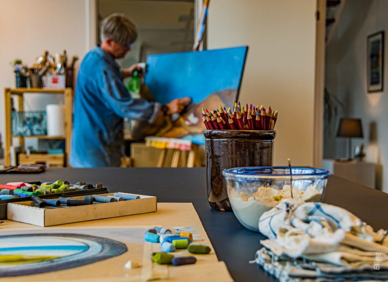 Naturens motiver, farverne og det rustikke miljø i og omkring Hirtshals strand og havn danner baggrund og inspiration for Lailas arbejde med tegning, maleri og collage.