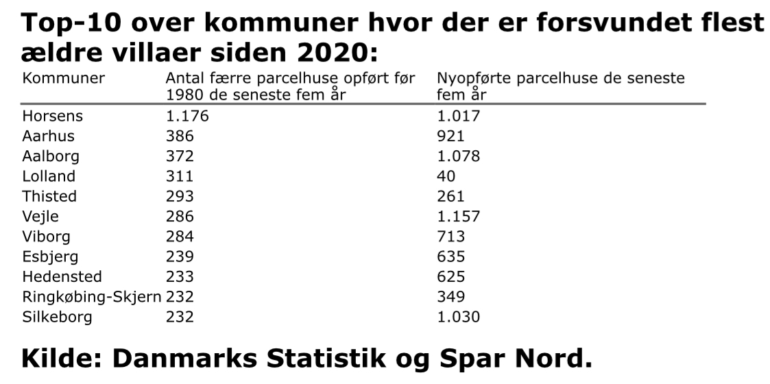 Horsens Kommune topper listen over kommuner, hvor der de seneste fem år er forsvundet flest villaer fra før 1980 med hele 1176 færre villaer. Herefter følger Aarhus Kommune og Aalborg Kommune med henholdsvis 386 og 372 færre, inden Lolland Kommune og Thisted Kommune runder top-5 af med henholdsvis 311 og 293 færre villaer fra før 1980.