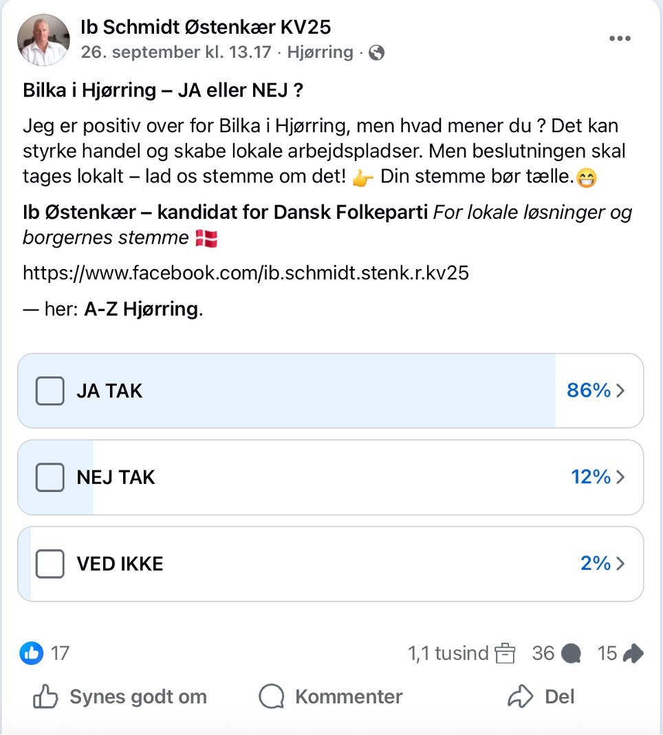 Hvis der er en ting, der kan samle borgerne i Hjørring kommune, så er det ønsket om en Bilka. Det viser en meningsmåling, som Ib Schmidt Østenkær(DF) satte i søen i fredags inde på Facebook gruppen Hjørring og Omegn – Netop nu.