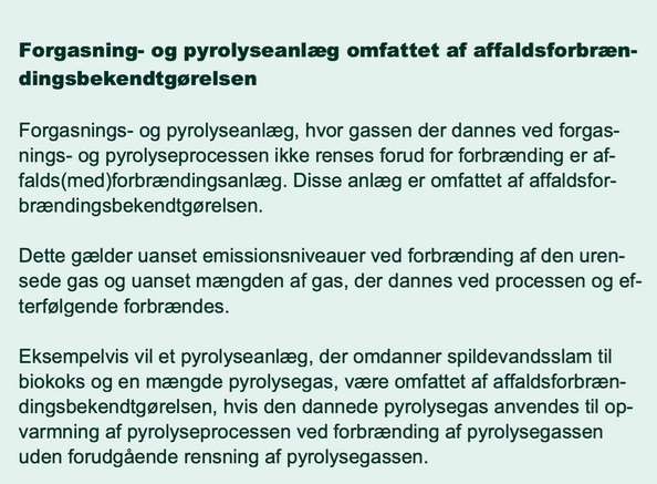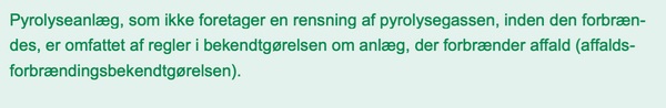 At kravet om rensning af pyrolysegassen er afgørende, fremgår ikke bare af Affaldsforbrændingsbekendtgørelsen, men også af diverse vejledninger udgivet af Miljøstyrelsen. Herunder følger to eksempler: