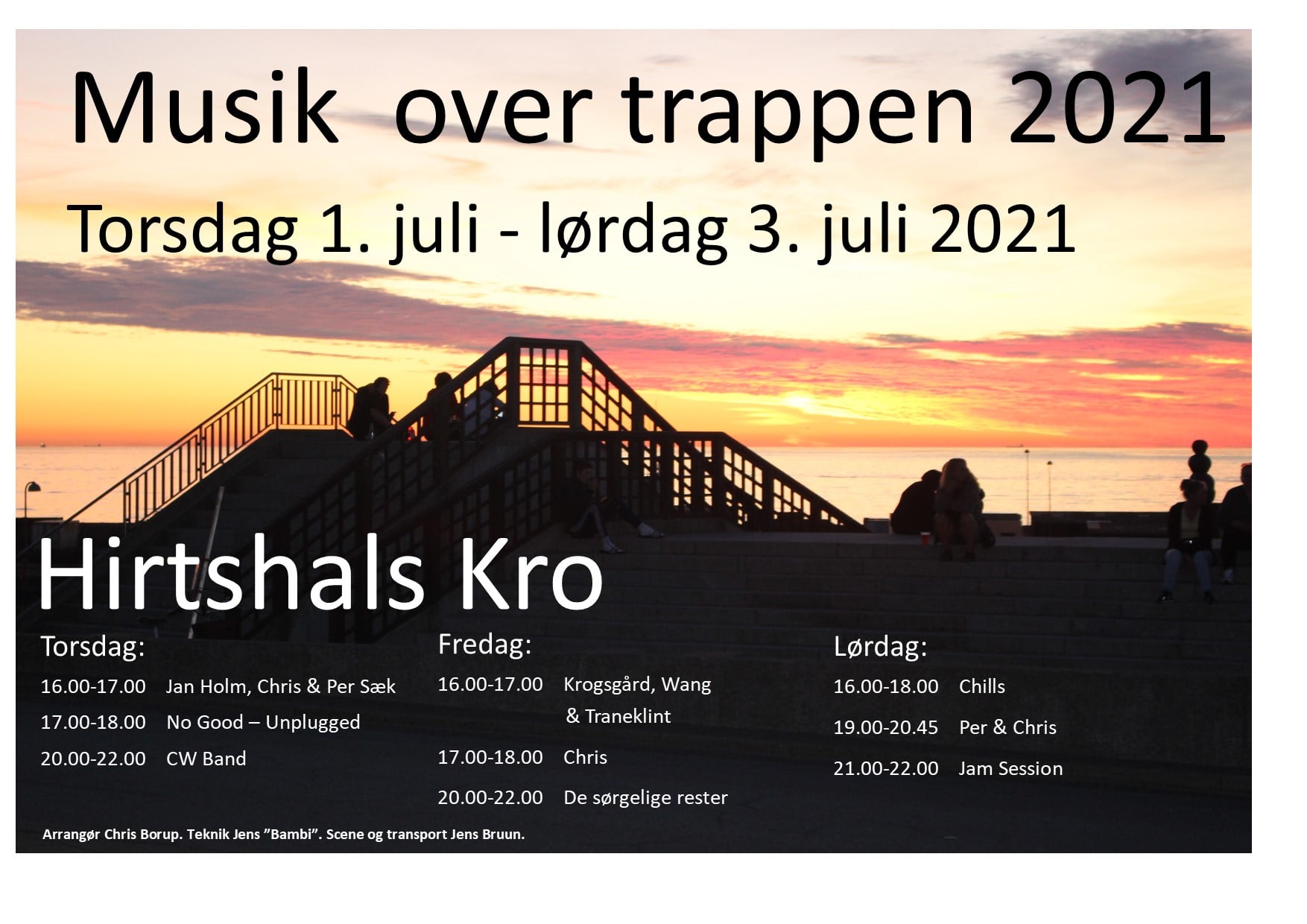 Igen i år er det så fornylig desværre meldt ud, at Musik Under Trappen atter aflyses, men der gik altså heldigvis ikke mange dage, før Per Kro nu igen tager sagen i egen hånd og ud over arrangementet til Sankt Hans også lægger parkeringsplads til Musik Over Trappen 2021 foran Hirtshals Kro.