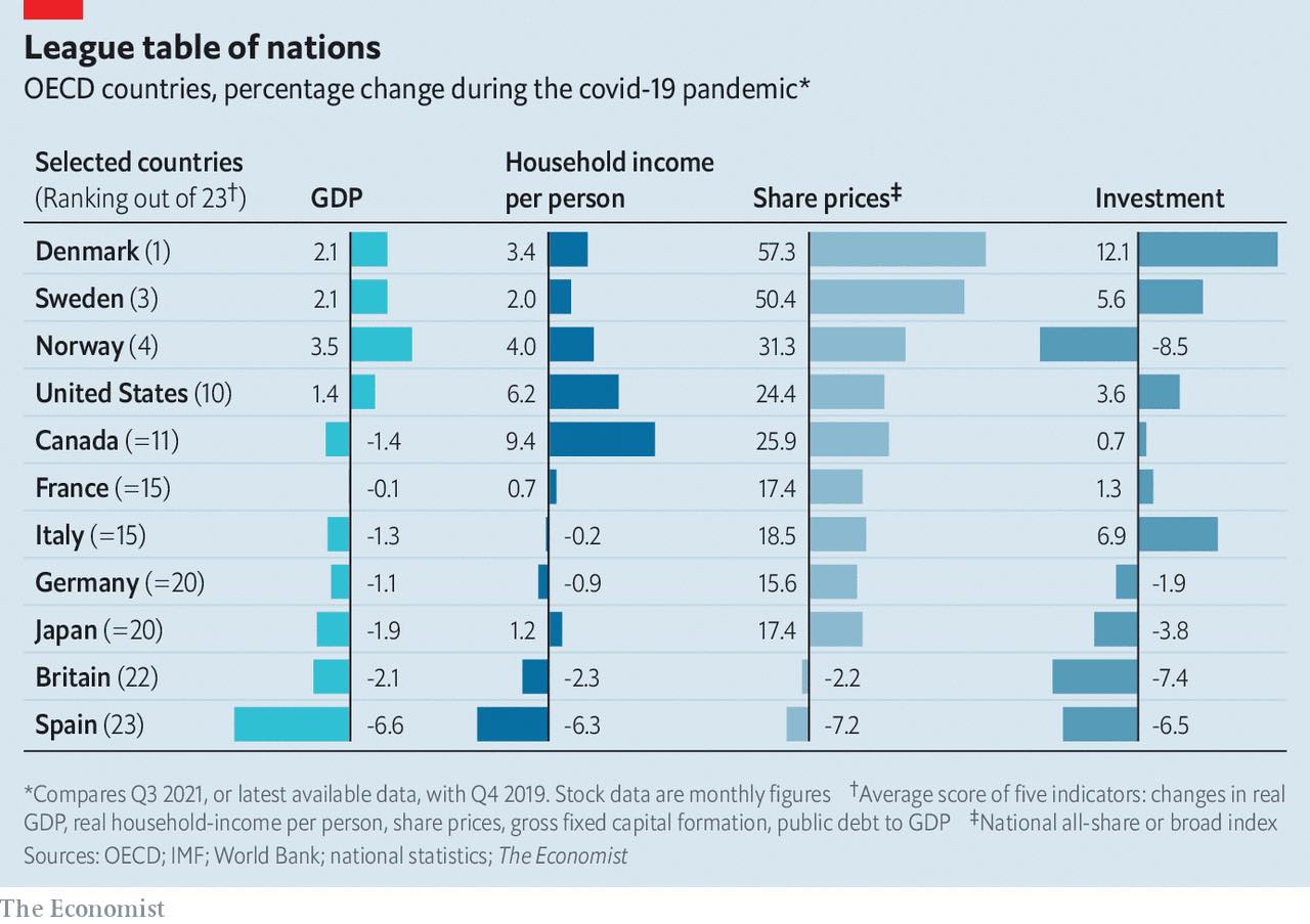 På en af årets sidste dage er her en vigtig oversigt med en vigtig nyhed. På billedet ser I, hvordan en lang række lande har klaret den økonomiske side af coronakrisen – og Danmark ligger øverst.