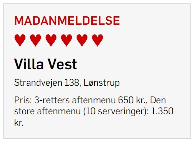 – I Lønstrup, på Danmarks øverste hylde, med solen, himlen og havet som sammensvorne, får de det hele til at se så nemt ud, lyder det afslutningsvis fra den ovenud begejstrede madanmelder, som derfor også gav den lokale restaurant 6 ud af 6 mulige hjerter i Politiken.