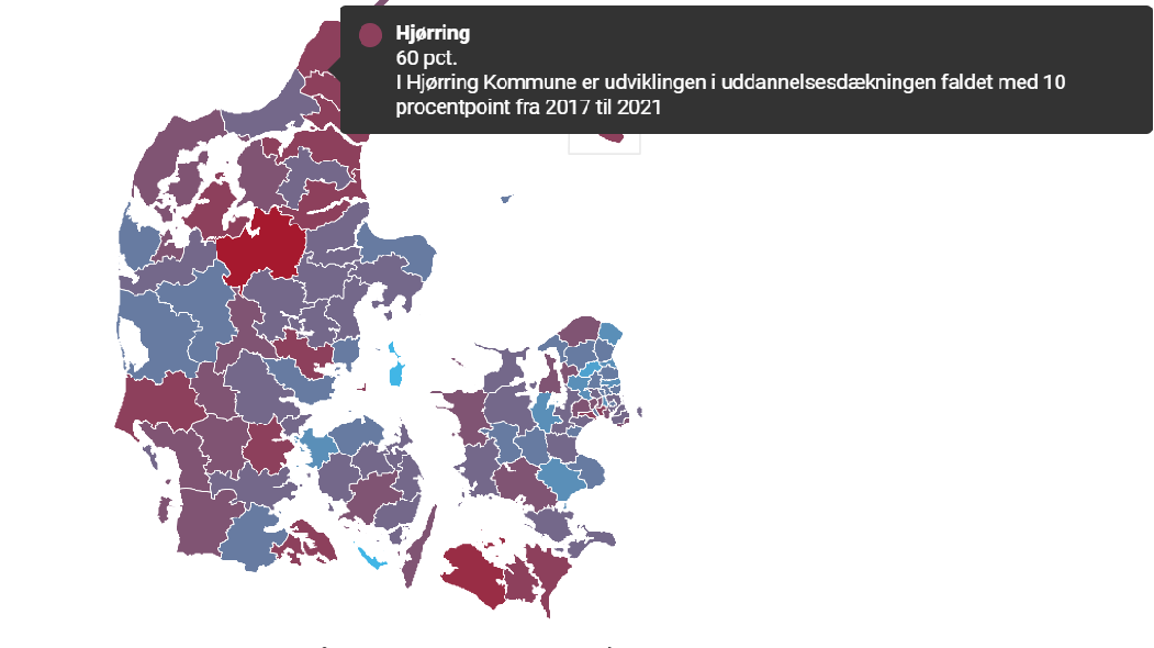 Nogle af de kommuner, hvor udviklingen har været særlig grel, er Gentofte og Aabenraa. Her er uddannelsesdækningen i de seneste fire år faldet med hhv. 18 og 17 procent. Således er der i begge kommuner nu færre uddannede end ufaglærte ansat inden for det pædagogiske område, nemlig 46 og 47 procent. I Allerød er uddannelsesdækningen helt nede på 39 procent.