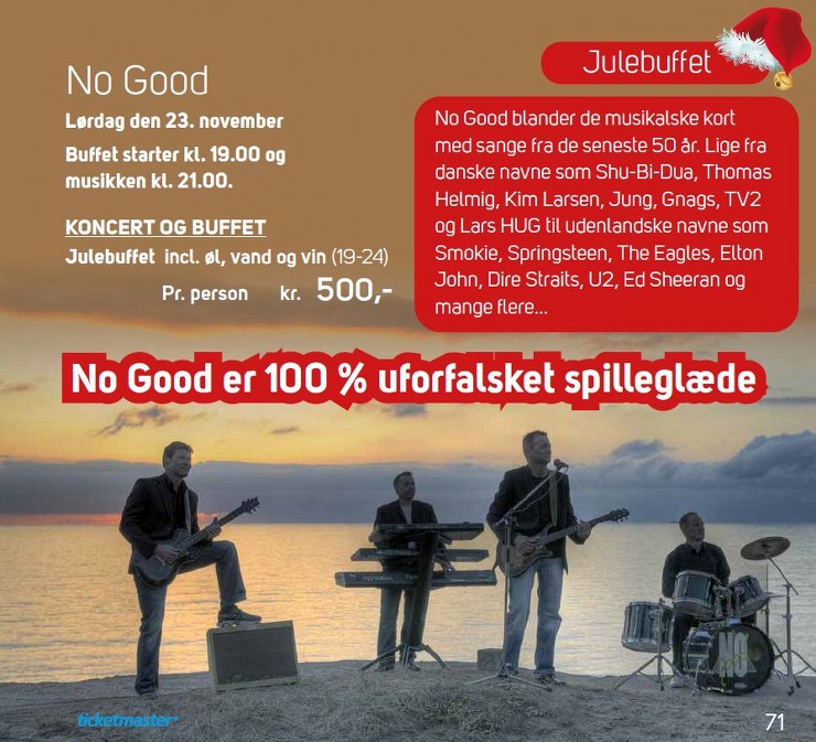 No Good spiller i Tversted lørdag den 23. november med buffet fra klokken 19 og musik fra klokken 21. Julebuffet inklusive øl, vand og vin fra 19-24 samt koncert koster 500 kroner. Billetter kan bestilles hos Restaurant Tannishus på telefon 9893 1482 eller hos Ticketmaster.