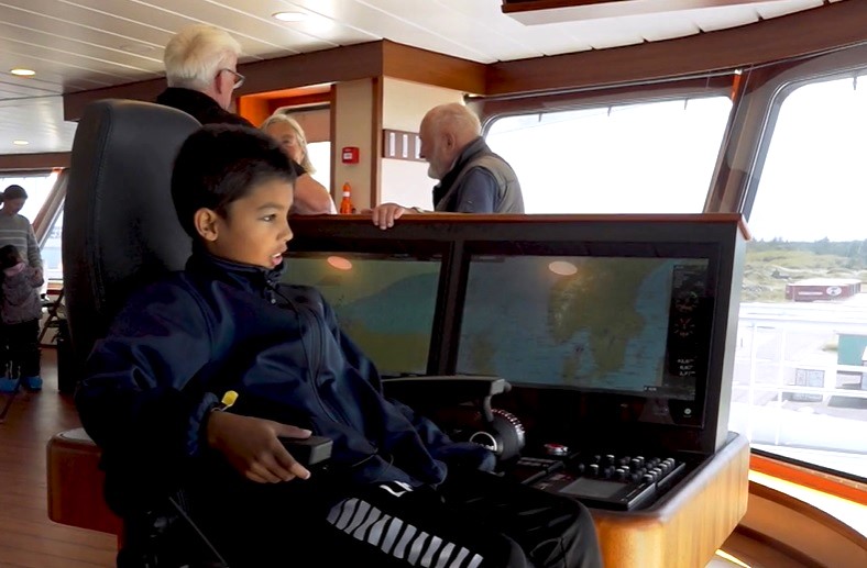 En af de forventningsfulde gæster tirsdag var niårige Lukas Knudsen, og han skulle ikke bruge mange sekunder i de store sæder i styrehuset for at godkende deres kvalitet. I det hele taget er drengen fra Hjørring imponeret over det store skib i Hirtshals Havn.