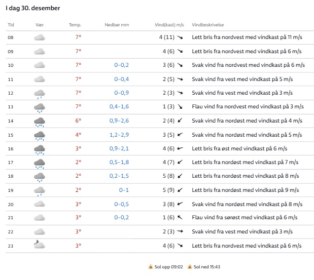 I løbet af dagen kommer der regnvejr i hele landsdelen, mens temperaturerne falder, noterer TV2 Nord. Omkring klokken 15 er temperaturen 4 til 7 grader alt efter, hvor man befinder sig.
