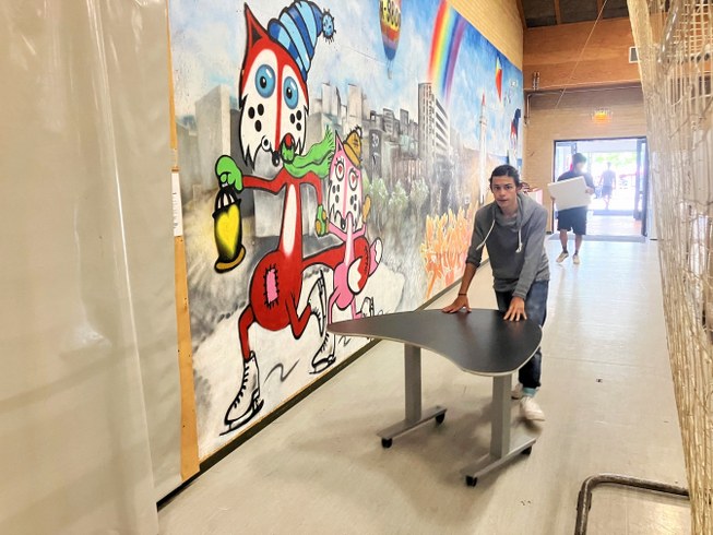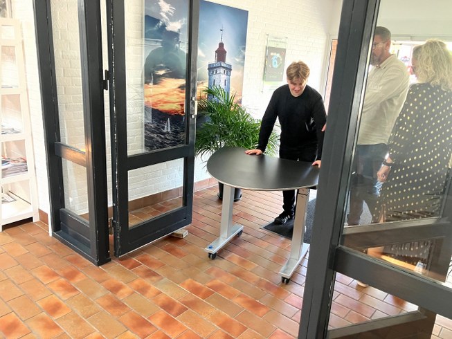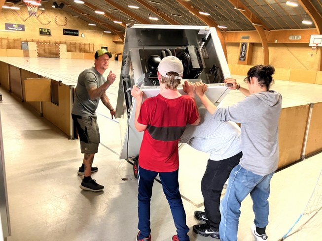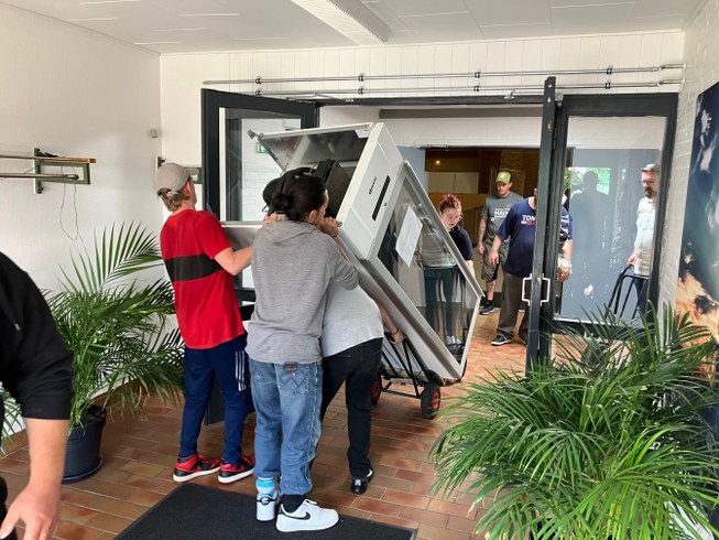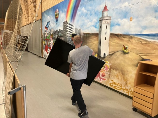 Ind i skolegården rullede nemlig en stor lastbil fyldt med fine genbrugsmøbler og andet udstyr til kontorer, klasselokaler med videre. Det skulle naturligvis bæres på midlertidig plads i den store idrætshal, og sådan noget stiller krav til at kunne koordinere, samarbejde og til at kunne se værdien i at yde en indsats.