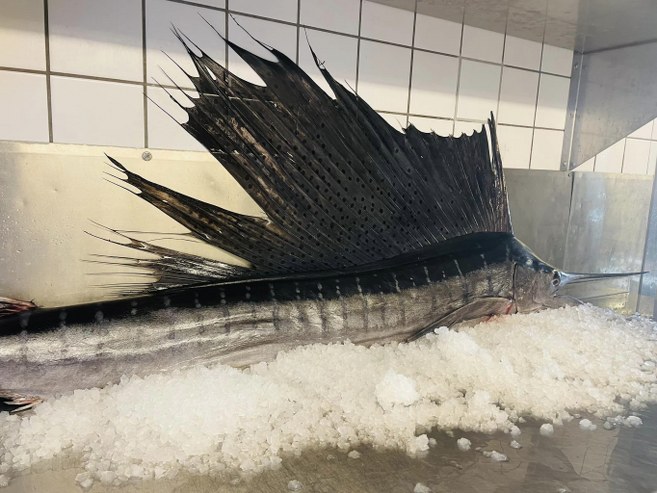 Sejlfisken kendes på det flotte store sejl. De kan bliver omkring 2,5 meter og veje 20 til 30 kg. Så det er et flot eksemplar, vi har skaffet hjem på knap 23 kg, lyder det fra den skarpe fiskehandler.