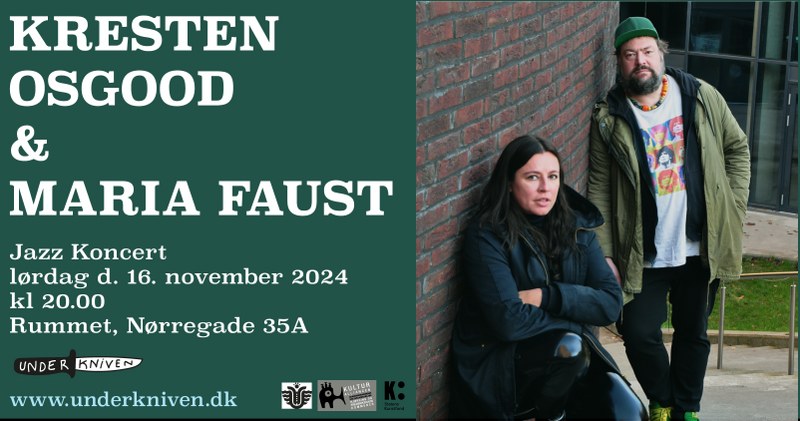 Lørdag er der jazz på programmet, når duoen Kresten Osgood & Maria Faust spiller koncert i Rummet. Kresten Osgood er en meget produktiv og legendarisk københavnsk jazz-trommeslager, og Maria Faust er ligeså utroligt aktiv i det danske og københavnske jazzmiljø med sit improviserede saxofonspil.