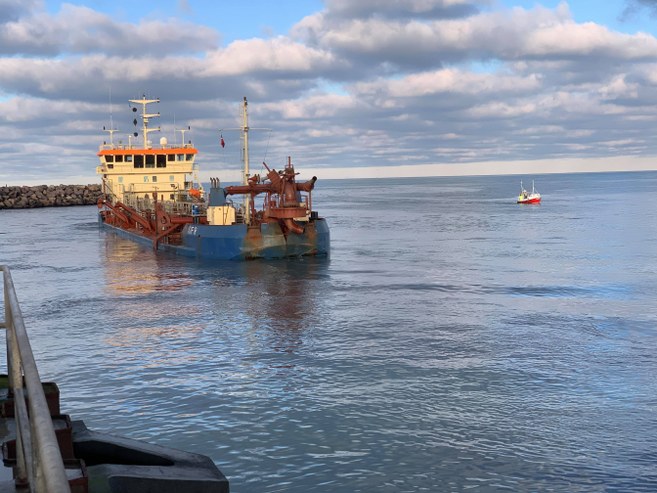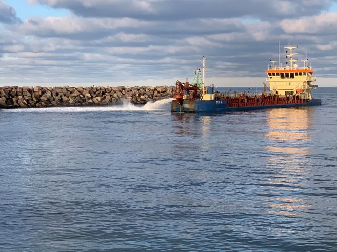 Lørdag rundede mange borgere da også molehovedet, idet fartøjet på det tidspunkt kom helt tæt på, hvilket gav gode muligheder for at følge det hollandsk indregistrerede fartøjs arbejde, hvorunder det ind imellem, som en legesyg hval, sendte en sprudlende søjle af til tider meget mudret pumpevand op i luften.