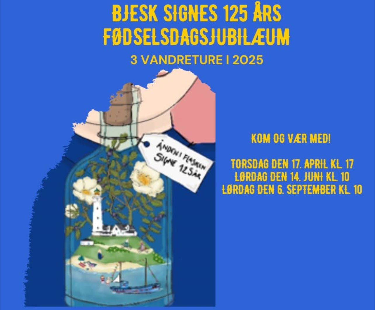 – Min hobby som vandreguide med mange ture i området, kommer vi ofte ind på bjesktemaet og Signe Hansen – og jeg serverer nogle gange en bjesk brygget på Signes opskrifter. Da jeg blev spurgt om jeg kunne være en del af programmet i dette jubilæumsår, var jeg selvfølgelig ikke i tvivl. Og jeg glæder mig til at gennemføre de tre guidede ture hen over året. Og ja, selvfølgelig bliver der budt på en bjesk undervejs, tilføjer Lars Hansen.