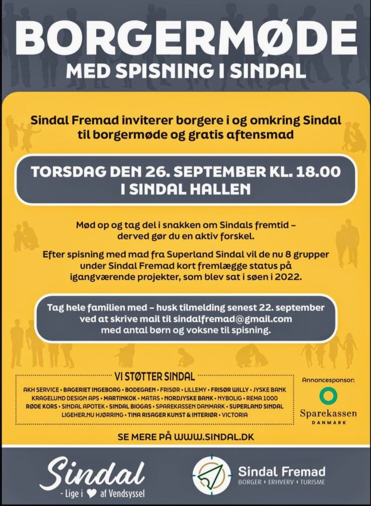 Sindal Fremad indbyder alle borgere i og omkring Sindal til et borgermøde kombineret med en gratis aftensmad. Arrangementet finder sted torsdag den 26. september kl. 18.00 i Sindal Hallen.