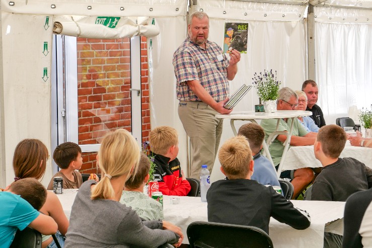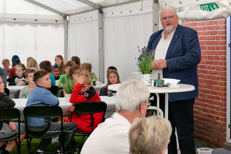 Peter Houen Sørensen fra bestyrelsen fortalte om vandværkets samarbejde med lokale skoleklasser. 35 børn deltog i receptionen, og vandværket donerede elevbøger om vand til skolerne.