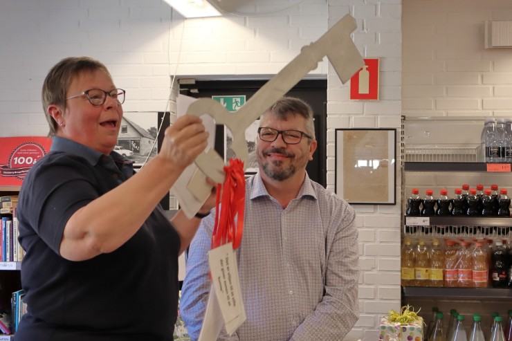 Efter Karens rørende ord blev der skålet og råbt hurra for brugsens fortsatte gode fremtid, inden hun formelt overrakte “nøglen” til Mosbjerg Brugs til Henrik Pedersen, der lovede at passe godt på den “bette brugs”.