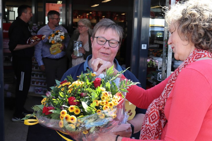 De mange fremmødte havde ikke blot lykønskninger med til Karen. Blandt de mange gaver og blomster var en særlig hilsen fra de unge, der har haft deres fritidsjob i brugsen. I et kort udtrykte de deres dybe taknemmelighed for Karens lederskab, støtte og tålmodighed gennem årene.