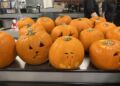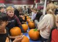 Børnene kløede på med krum hals. De to lærerstuderende, som også var med, hjalp sammen med Kenneth fra SuperBrugsens bestyrelse med at skære toppen af. Alle skulle dernæst selv lave udskæringer, og det kom der nogle skræmmende flotte hoveder ud af.