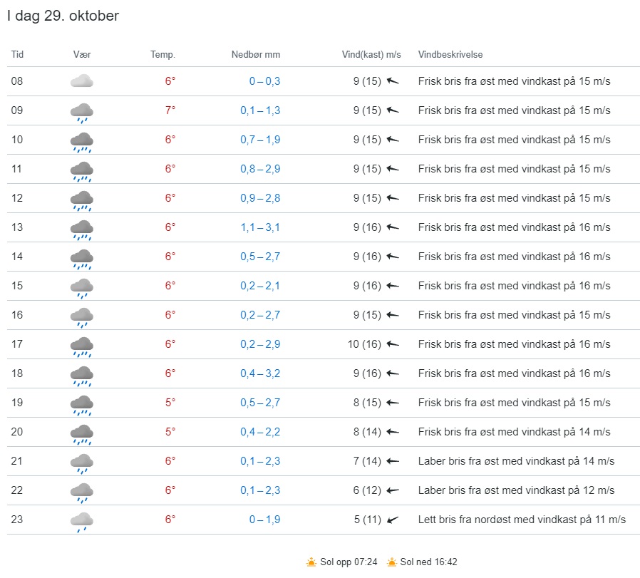 Temperaturer mellem 8 og 14 grader. Jævn til frisk vind fra øst, men ved kysterne op til kuling, der drejer til sydvest og aftager til svag til frisk. I aften og i nat skyet med regn eller byger, der i den sydlige del kan være med torden.