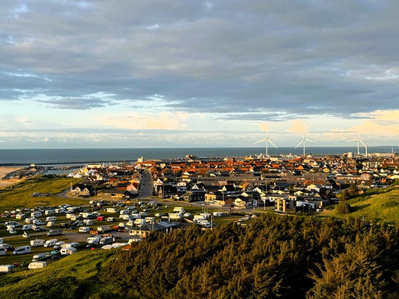 Fra toppen af sidstnævnte kunne det ved selvsyn iagttages, hvor mange biler der fortsat holdt på den midlertidige parkeringsplads nord for den ligeledes helt optagede Hirtshals Camping.