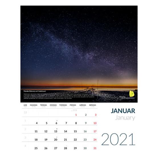 Med Naturkalenderen 2021 kan man hver måned se og læse om den skønneste natur i Danmark og samtidig blive klogere på dyre- og plantelivet i det pågældende område. Samtlige månedsark indeholder en stor oversigtskalender med ugenumre, helligdage, og månefaser indtegnet.
