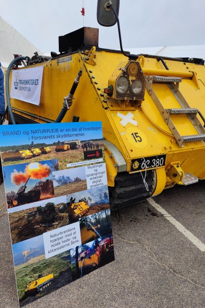 Umiddelbart rimer det ikke i mine ører, at massive skydeøvelser med panserbrydende granater og lignende skulle kunne gå i spænd med naturpleje… men sådan er det øjensynligt… Store dele af hærens øvelses- og skydeterræn i Oksbøl er – når krigen ikke øves – er tilgængeligt for offentligheden – man skal bare holde øje med de røde kugler… Bæltekøretøjet her skyder i øvrigt kun med vand…