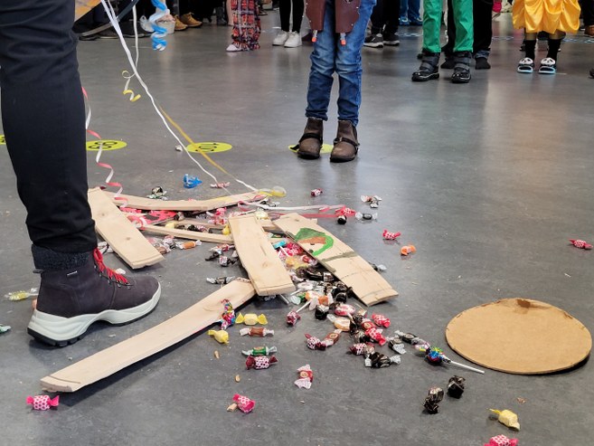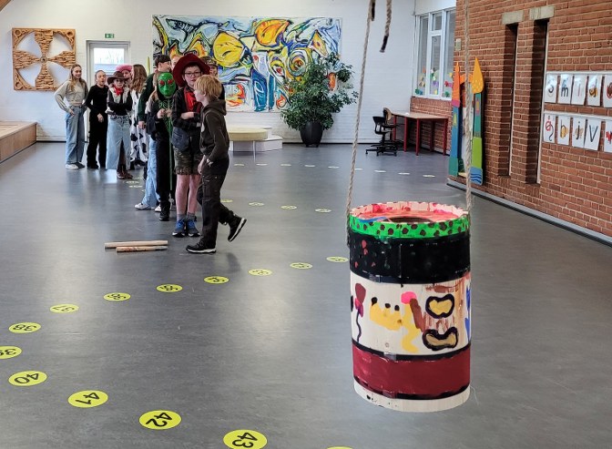 Næste del af arrangementet var på Bindslev Skole, hvor Bindslev Spejderne havde hængt fire tønder op til fire aldersgrupper. Der blev gået til den for at få slået hul på bunden af de fire tønder og dermed få alt den slik ud, der var i tønderne.