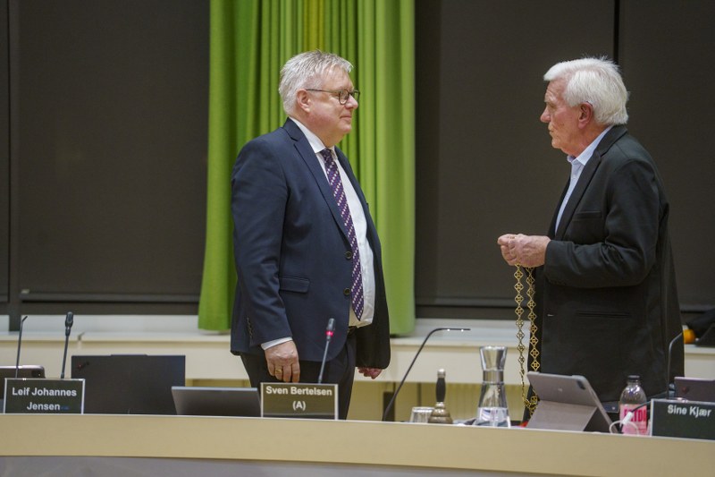 Sven Bertelsen (S) har netop overrakt borgmesterkæden til Søren Smalbro (V):