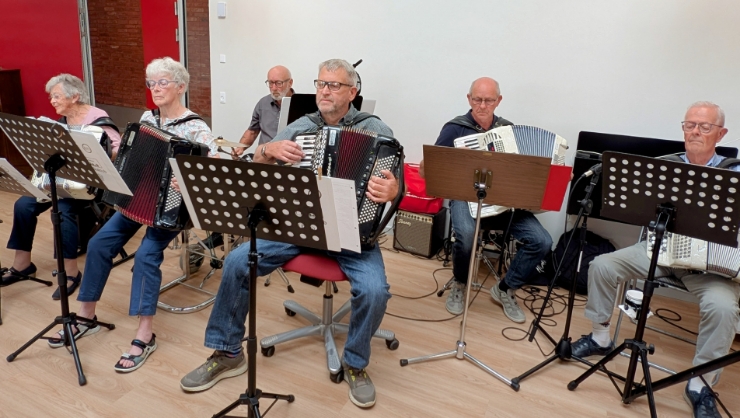Det seks mand store harmonikaband fra Tårs-Lendum Harmonikaklub åbnede med en halv times koncert, der bød på kendte danske sange, som hurtigt fik smilet frem hos publikum.