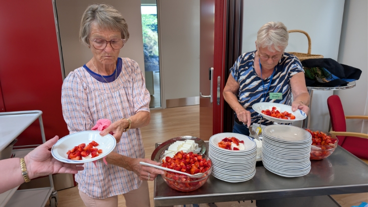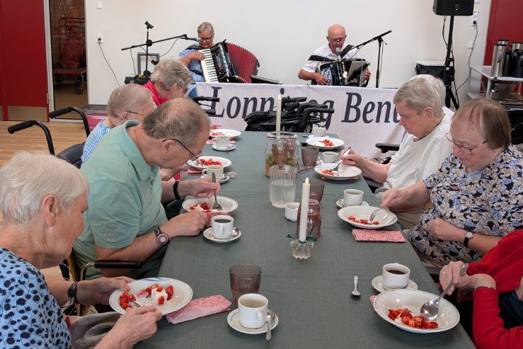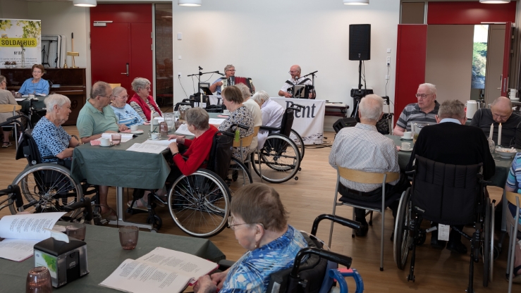 Torsdag bød Soldalhus frivillige fra Dame- og Herreklubben på en festlig eftermiddag fyldt med fællessang og søde sager. Arrangementet, som var det sidste af sin slags inden sommerferien, bød på underholdning fra den populære duo Lonnie og Bent til stor glæde for de ældre beboere.