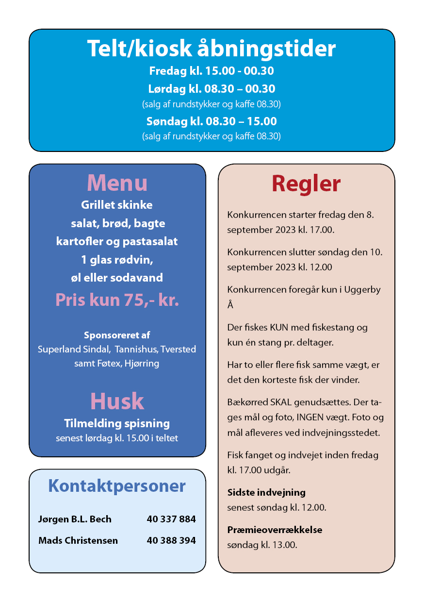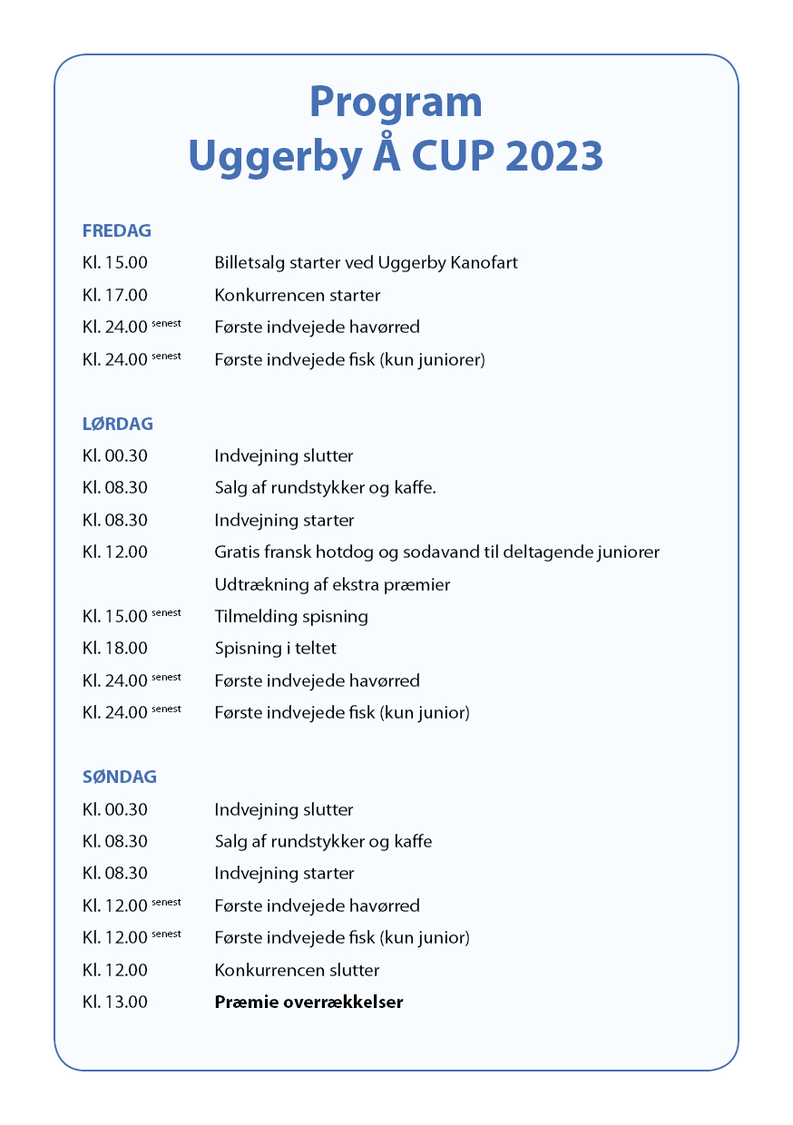 Uggerby Å Cup har igen i år base og udgangspunkt ved Uggerby Kanofart. Deltagerbevis kan købes på pladsen. Nedenfor ses info fra arrangørerne hos Sportsfiskerforeningen for Hjørring og Omegn.