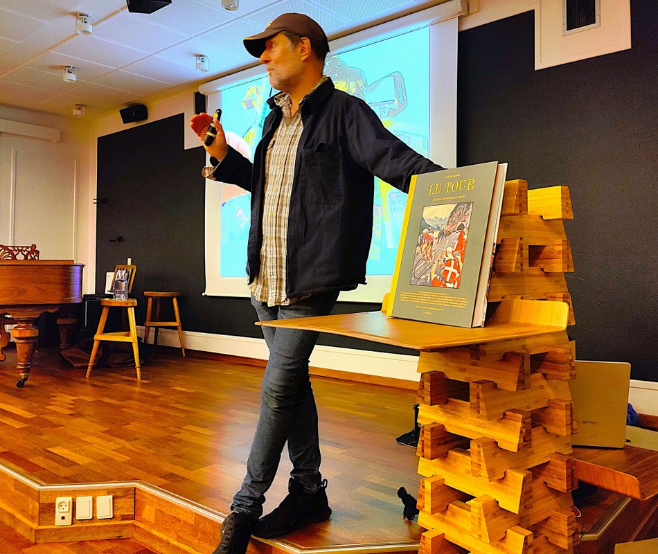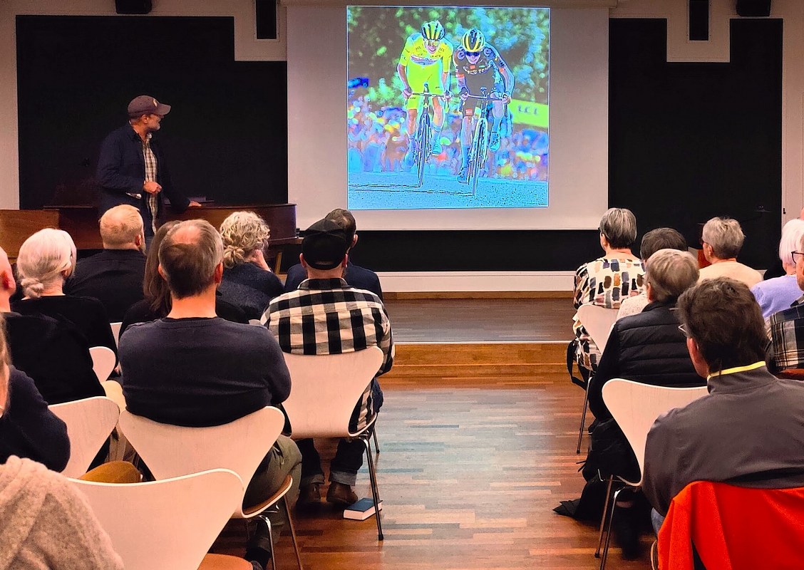 Denne aften handlede det mest om Tour de France med udgangspunkt i Mejlvangs bog LE TOUR… Vi møder alle de kendte, de dopede, de vindende, sliderne, vandbærerne og stjernerne… og sportsfotografens kamera arbejder gerne på tider, hvor andre er taget hjem på hotellet, og på steder, hvor han ikke nødvendigvis havde spurgt pænt om lov på forhånd…