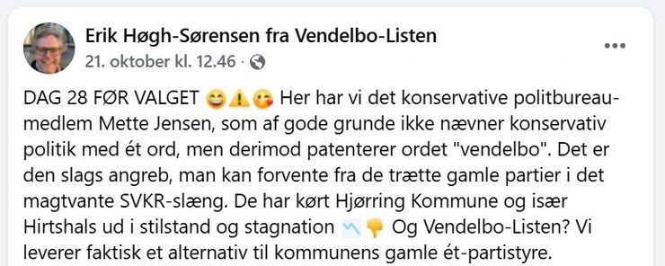 Vendelbo-Listens byrådsmedlem Erik Høgh Sørensen bruger af og til betegnelsen ”politbureau”. Det skete blandt andet den 21. oktober i et indlæg på borgmesterkandidatens Facebook: ”Her har vi det konservative politbureau-medlem Mette Jensen”, skrev han blandt andet.