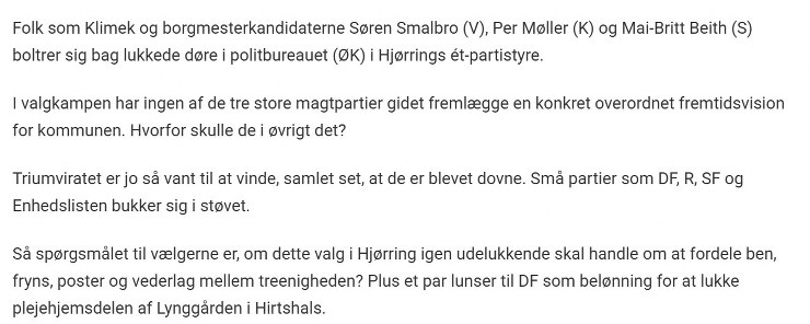 Et par dage efter skriver han, at ”folk som Klimek og borgmesterkandidaterne Søren Smalbro (V), Per Møller (K) og Mai-Britt Beith (S) boltrer sig bag lukkede døre i politbureauet (ØK) i Hjørrings ét-parti styre.