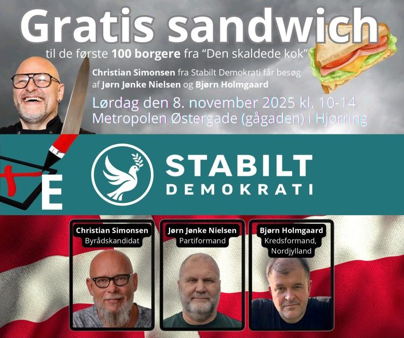 Lørdag den 8. november 2025 inviterer partiet Stabilt Demokrati til politisk samvær og gratis sandwich i hjertet af Hjørring. Arrangementet finder sted fra kl. 10 til 14 på Metropolen Østergade, byens gågade, og byder på både politisk dialog og en kulinarisk gestus til de første fremmødte.