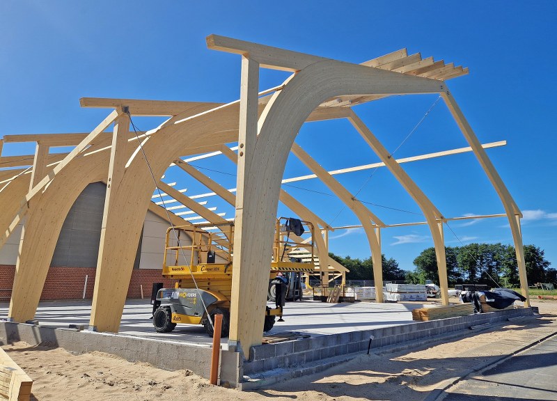 Lilleheden A/S har leveret bærende limtræskonstruktioner som blandt andet limtræsrammer med krumme hjørner, udført som 3-charniers-rammer – to separate dele, der samles med beslag i kippen. Dernæst rammer i varierende dimensioner, hvor de største måler 185 x 633 mm med længder på 10,5–11 meter. Endelig også tilhørende sidebygningselementer i 185 x 400 mm, med længder fra 2,9 til 4,2 meter.