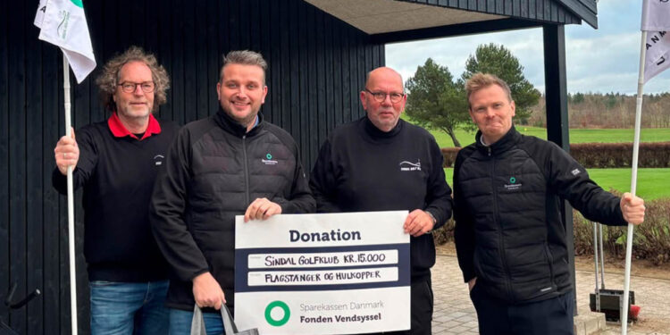 Mads Nielsen og Oliver Hjorth Karlborg fra Sparekassen Danmarks afdelinger i Sindal og Hjørring hjalp fonden med at overrække donationen til repræsentanter fra Sindal Golf Klub.