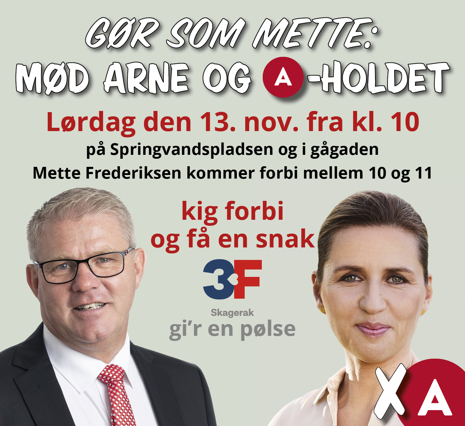 Statsminister Mette Frederiksen deler lørdag klokken 10.30 røde roser ud og får en kort snak med folk på gaden sammen med de socialdemokratiske kandidater til kommunal- og regionsvalget. Efterfølgende er 3F Skagerak vært ved en pølse på gågaden i Hjørring.