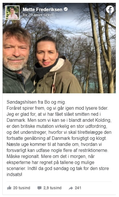 – Næste uge kommer til at handle om, hvordan vi forsvarligt kan udfase nogle flere af restriktionerne. Måske regionalt. Mere om det i morgen (mandag, red.), når eksperterne har regnet på tallene og mulige scenarier, skriver Mette Frederiksen søndag eftermiddag i et opslag på Facebook.
