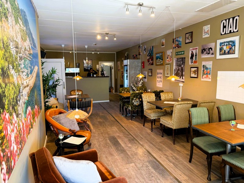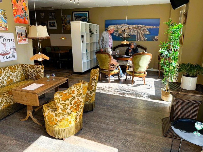 Her har indretningen virkelig fået fuld skrue med masser af italiensk lokalkolorit i form af både billeder og hyggelige møbler med sjæl, hvor gæsterne i ro og mag kan nyde de udsøgte vine og kulinariske fristelser.